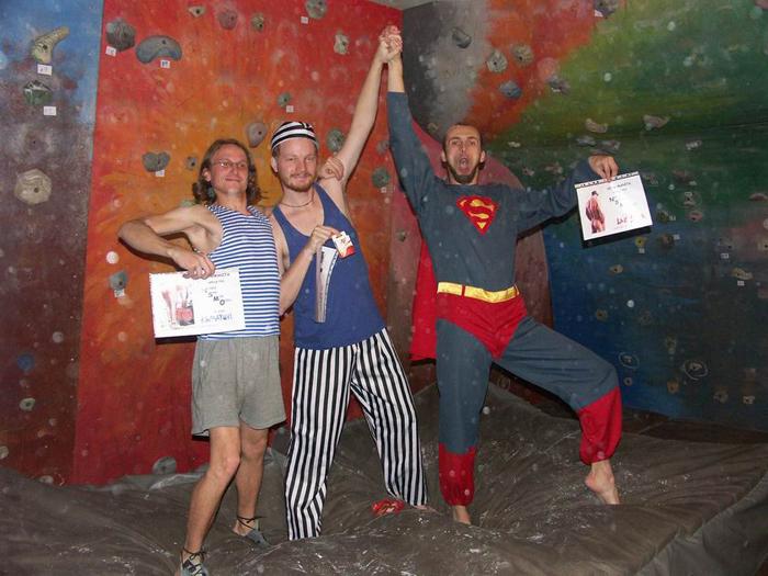 V čem byl jiný nežli loni? Zdá se, že to s humanitními muži není tak zlé, jak by se snad na první pohled zdálo. Díky vyhlášení nové kategorie notoričtí nelezci a rakváči se do závodů přihlásili takové osoby, které potkáte na umělé stěně s přibližně stejnou pravděpodobností, s jakou narazíte v Himalájích na Yettiho. Ano, už jistě tušíte že mluvím o tzv. svaté Trojici z Kozácké ulice - Tokovi, Sejkovi a Savcovi. Aneb jak psal Tok v jedné esemesce, jednou i slunce vyhasne, peklo zamrzne, vesmír zanikne a Tok přijde na umělou stěnu. Ta chvíle tedy nadešla minulou neděli. Tuto pestrou skvadru pak ještě doplnil stejně proslulý Pojídač a známý pražský prášil a cestovatel Vrána. Zklamal jedině Oveček, který nedorazil. Na druhou stranu se jistě ulevilo organizátorům, kterým se nepodařilo zajistit dodatečný podpěrný systém umožňující startovat i takovýmto váhovým kategoriím.