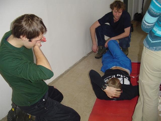 V sobotu Filip zahájil přednáškou Omrzliny a podchlazení, přičemž jsme se kromě praktických rad dozvěděli i fígle typu Kterak amputaci zčernalé končetiny nouzově prováděti apod. Následovalo praktické vyzkoušení poskytnutí první pomoci, což považuji za největší přínos zdravotnické části víkendu. Bára namaskovala Filipovi moc pěkný úraz a pak se na nebohého figuranta vrhaly dvojice zachránců. Až na dvě světlé výjimky (Bidlo+Beruška, Gobo+Renča) zachraňovaný díky obětavé pomoci zemřel, protože nikdo pořádně nevyšetřil páteř.