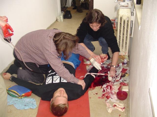 V sobotu Filip zahájil přednáškou Omrzliny a podchlazení, přičemž jsme se kromě praktických rad dozvěděli i fígle typu Kterak amputaci zčernalé končetiny nouzově prováděti apod. Následovalo praktické vyzkoušení poskytnutí první pomoci, což považuji za největší přínos zdravotnické části víkendu. Bára namaskovala Filipovi moc pěkný úraz a pak se na nebohého figuranta vrhaly dvojice zachránců. Až na dvě světlé výjimky (Bidlo+Beruška, Gobo+Renča) zachraňovaný díky obětavé pomoci zemřel, protože nikdo pořádně nevyšetřil páteř.