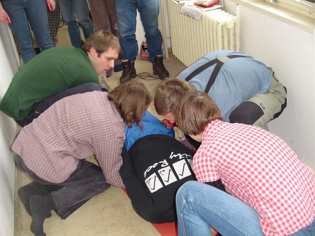 V sobotu Filip zahájil přednáškou Omrzliny a podchlazení, přičemž jsme se kromě praktických rad dozvěděli i fígle typu Kterak amputaci zčernalé končetiny nouzově prováděti apod. Následovalo praktické vyzkoušení poskytnutí první pomoci, což považuji za největší přínos zdravotnické části víkendu. Bára namaskovala Filipovi moc pěkný úraz a pak se na nebohého figuranta vrhaly dvojice zachránců. Až na dvě světlé výjimky (Bidlo+Beruška, Gobo+Renča) zachraňovaný díky obětavé pomoci zemřel, protože nikdo pořádně nevyšetřil páteř.