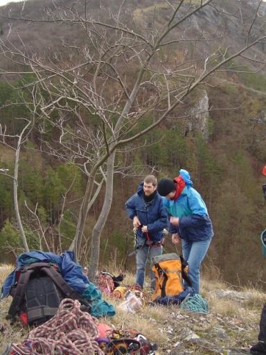 V neděli se nás sešlo o něco méně - jen devět, oproti sobotním patnácti. Ve Svatém Janu pod Skalou dle domluvy zazvonil telefon, volal Ondra Turek, že si tatínek ve stěně cosi udělal a nemůžou dál. Pomóóóc! Obešli jsme Dušičkovou stěnu zleva, ustrojili se do lezeckého a začali slaňovat k ťuhýkům. Při pohledu přes hranu Cesty kamarádů z Tour Ronde nás čekalo překvapení, které Kuba sliboval. Počítali jsme sice s tím, že si do stěny vezme jedno dítě, ale že si vezmě obě? Záchrana slaněním a spuštěním dolů s jedním mezi-štandem proběhla hladce zejména proto, že jsme si techniky nacvičili v sobotu v Hlubočepech. V bahně na úpatí stěny jsme sestrojili improvizovaná nosítka a slavně dovlekli Kubu na plácek u chat. Stáhnout jednoho dospělého a dvě děcka ze stěny bez jejich spolupráce nám zabralo hodinu a tři čtvrtě.