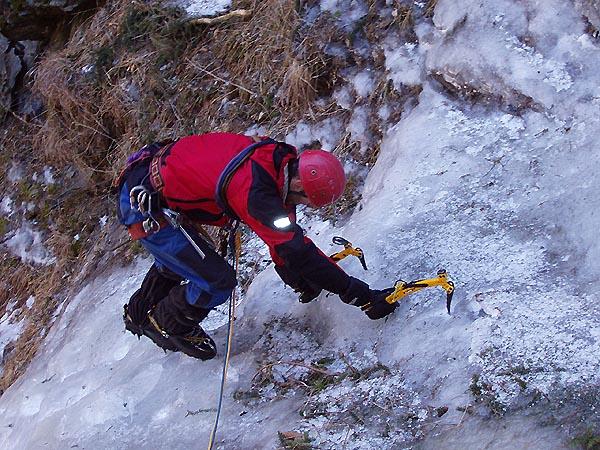 Sobotní odpoledne Bidlo zdolal dvě nejhezčí a nejtěžší délky víkendu v horní části ledopádu Supermax WI 5-. Já za ním dvě nejtěžší asi osmimetrová ledová místa proseděl. Zlaté reverzo!