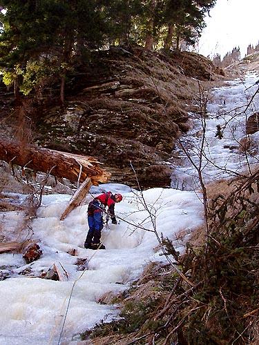 Naštěstí přišla neděle a šli jsme na plezír a genuss. To jsem si zase užil já. Několik kaskád na potoce Strannerbach bylo odděleno pochodovým terénem, výborné možnosti jištění o stromky i ledovcovými skobami. Byl tam sice provoz, protože je to dlouhý a krásný lehký led, ale moc nám to nevadilo.