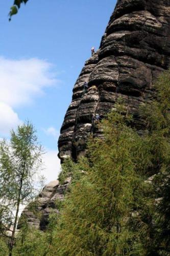 O víkendu jsme vyrazili do Sächsische Schweizu zdolávat velká pískovcová hovada Falkenstein a Bloszstock. Prvně jmenovaného obra obléhali celou sobotu pouze Mirek s manželkou, Brťan a Evusa, přestože jsme měli dohodnutý sraz na parkovišti pod Affensteiny. My s Lukýskem,Simčakem a Požerákem alias Pojídačem jsme vzlínali povinnýma klasikama od pětek po dvouhvězdičkové VIIb v centrální části Affů. Pojídač celý den pod přísnou drezúrou Lukáše pilně trénoval sokolíky, žábovice a rajbasy, dokonce si velmi pochvaloval cestu Westkante VIIa na Brückenturm, kterou solidně na druhém přelezl. Problémem byly trochu ziminka a větříček, který nás kupříkladu právě na Westkantě málem odfoukával ze stěny. Ale na sluníčku bylo letně teplo. Ale ani tam se ony devětadvacítky avizované panem Zakopčaníkem nějak nedostavovaly.