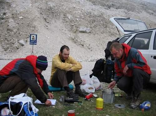 Dojdeme zpátky k autu, uvaříme, postavíme stany a čekáme na kluky. Večer přišel Pionýr, jestli s ním nepůjdem naproti ostatním. Stále totiž chybí Píťa s Martinem, Radek s Pavlem a čtyři lidi z HoSoHoPo. Padla tma a horní část Čim už dávno před setměním halí studená mračna. Do půl jedenácté čekáme dole u kapličky a pozorujeme tři světýlka, pak se konečně objeví všech osm unavených postaviček...