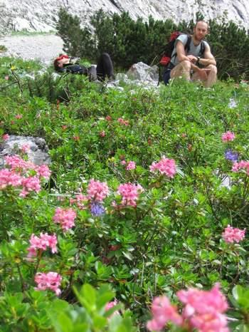 pičas divnej, ráno dvě přeháňky, vyrazili jsme trekovat do západní strže pod Totenkirchl a vylézt na sedlo bla,bla,bla.. ve dvoutisících-pěkný vejhled na golfové hřiště v dolině. Pičas se během drápání do sedla umoudřil, odpoledne zase slunec, válení mezi červenýma azalkama pod západní stěnou, odpočinek, návrat stejnou cestou.