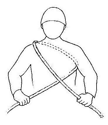 Obr. 4 - může mít nebezpečné následky, úplně selže, je-li lano vytrženo z podpaží, nesmí být použito, když má jistič na sobě silonový oděv (malé tření); jištění prvolezce jen na stupňovité skále, kde nehrozí volný pád a nebo tam, kde jsou četná postupová jištění; jištění druholezce OK, avšak křížová jištění jsou výhodnější; snadná manipulace s lanem; velmi obtížné až nemožné zafixování lana po pádu lezce - shrnutí: není to bezpečné, je však často používané pro svou jednoduchost