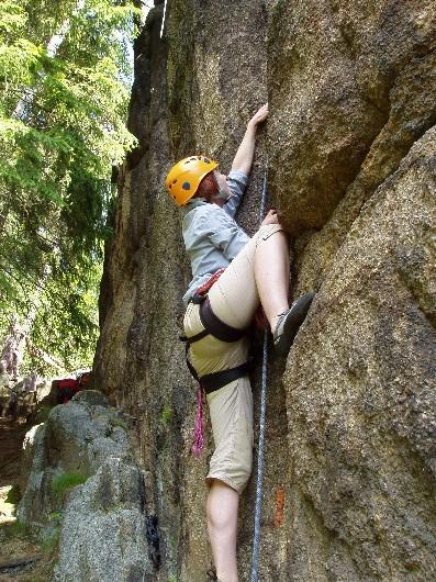 Vedro bylo vskutku kruté, takže jsme po většinu času lezli schovaní ve stínu skalních borovic na Muzikantech a v neděli i na Zámku. Většinu z nás, kromě Pionýra, docela nepříjemně zaskočila obtížnost zdejších cest, takže poté, co jsme já i Zahrada zapytlili rozlézací čtyřku, strávili jsme zbytek akce ve vláčku, vedeném lokomotivou Pionýrem.