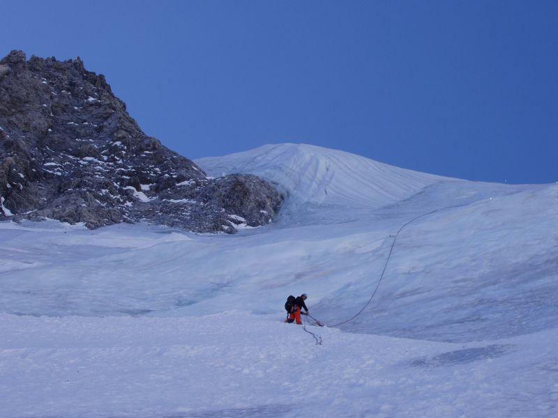 Tak jsme to přelezli. Těžší než jsme čekali. Srdce pravého horolezce by plesalo: cesta je dlooooouuuuuhááááá a náročná na fyzičku, kořeněná sprškami kamenů a kanonádami kusů ledu; my z toho byli trochu divoký. Ale zážitek každopádně velkej. Dávám sem alespoň pár fotek, třeba kluci něco napíší.