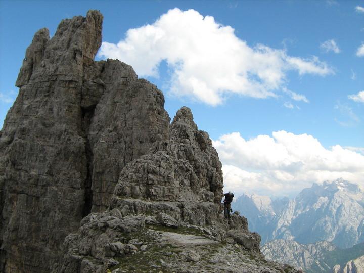 Další délky, ačkoliv jsou hodnoceny jako lehké, zas tak úplná sranda nejsou. Skála je občas dost lámavá a jen velmi málokdy narazíte na skobu. Navíc od čtyřky výš se po cestě pravidelně potkáváte s vypečenými bříšky a malými převísky, které dokáží dát slušně zabrat. Italové za námi znají v cestě zkratku, kterou ušetří jednu délku a dostávají se tak před nás. Postupně se nám také začíná zdát, že cesta zrovna dvakrát neodpovídá nákresu. IV+ ková pasáž je nějaká delší než by měla být, po spárkách z nákresu ani vidu ani slechu. Spíš je to pěkné lezení po pevných vápencových madlíčkách, občast trochu převislé. Vtipné je na tom to, že tady nejsou žádné skoby a není kam co zakládat, takže Bárt přelezá délky buď jen s velmi málo jištěním, nebo ty kratší dokonce v jednom dlouhém odlezu téměř od štandu ke štandu. Začínáme být nervózní z dalších těžkých pasáží, které mají přijít, a také z toho, zda budeme dost rychlí. Počáteční těžký kout už ale máme dávno za sebou a počasí nám také opravdu přeje.