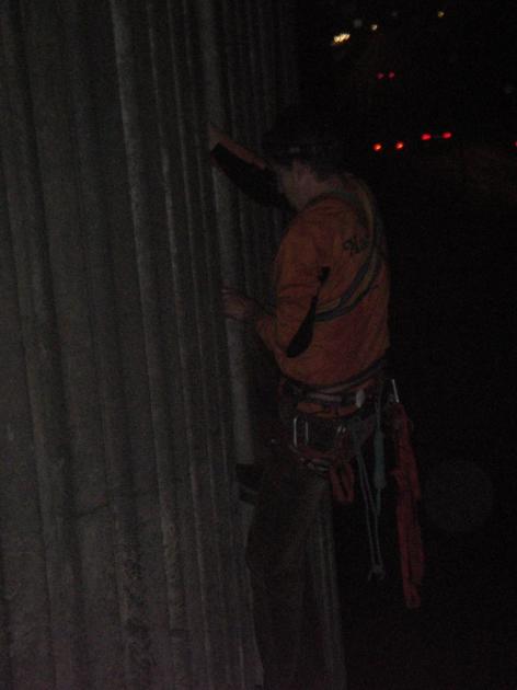 V mezičase, co jsem lezl, se nám taky obecenstvo (fotograf Tomáš, kterého s sebou vzal Mik) rozroslo o další osobu. Byl to nějaký děda s kořalkou, který patrně bydlel v nedaleké boudě či krabici. Dělal společnost Tomášovi při focení a údajně stejně jako Tomáš projevoval starosti jak o naše duševní, tak fyzické zdraví. Abychom se v případě dvanáctimetrového pádu ze stropu nepotloukli, lanařil Tomáše, aby s ním odněkud dovlekl asi 20 čísel tlusté kusy izolace jako doskočiště, čemuž Tom naštěstí odolal. :-) Jinak byl děda vděčný pozorovatel a vydržel sledovat celé představení až do našeho odchodu o dvě hodiny později.