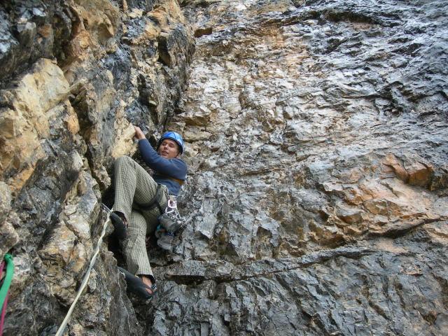 Lezení na půlden, tak to musíme na Sellu, pomyslím si. Nástupy hned u dvířek auta, kratší cesty, stěna Piz Ciavazes orientovaná na jih... bude pohoda. Odpočinkový den před návratem na Tre Cime. A když odpočinek, tak pořádný. Vybíráme si "jen" dvanáctidélkovou cestu Via Abram. Nebýt toho, že jsem špatně trefil nástup, byla by nádherná celá túra. Takhle máme první dvě délky pětkového lezení v nepříznivě vrstvené skále, kde nejde zajistit, namísto trojkové nástupové rampy. Jinak si ale užíváme krásné lezení ve vodou ohlazené skále. Jen kdyby ta klíčová délka neměla mokré chyty... A opět máme štěstí. Zmokneme až na sestupové pěšině. Těm dvěma, které vidíme délku pod ústupovou policí v cestě Velký Micheluzzi, tedy opravdu nezávidím. Cestou potkáváme Němce, který se nás ptá, zda jsme v cestě nenašli nějaké expresky a smyce. Před týdnem slaňovali z desáté délky dolů prý v hrozné bouřce. Ne, po týdnu jsme opravdu už na jejich zanechaný matroš nenarazili. Teď ale pryč od věží Sella, zpátky do Misuriny. Jsme zvědaví a trochu nervózní, spát jdeme kolem devété. Zítra vyrazíme do Cassinovy cesty na Cimu Ovest.