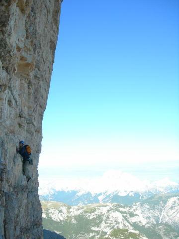 Jistím Míru na balkónku, odkud se doleva táhne výrazná police. Končí hranou, dál nedohlédnu. Zde Cassin našel v roce 1935 (!!!) klíč ke vstupu do severní stěny, jenž v přímém směru blokuje pás střechovitých převisů. Míra odcupitá po polici 15 metrů ode mne, udělá pár kroků kolmo vzhůru po lištách a zmizí za hranou. Psáno jest za 7a, ale není ani náhodou. Stanoviště je krásně exponované, ve dvou nýtech, jako po většinu cesty. Lana visí volně dolů a i kdyby sahala až na zem, není místa, kde by se přiblížila ke skále. Čím níže, tím je stěna vzdálenější. Jen chvíli si vychutnáváme společný vis. Přichází druhá těžká délka. Po pár krocích berou moje ideály čistého lezení za své. Osmičky na OS běžně nelezu, natož v horách. K tomu nám na záda dýchají Italové a za nimi naši známí Španělé. "Hola, amigo!", haleká jeden, který mě poznal. Já ti dám amigo, myslím si a vzpomínám na náš noční sestup z Cimy Grande.