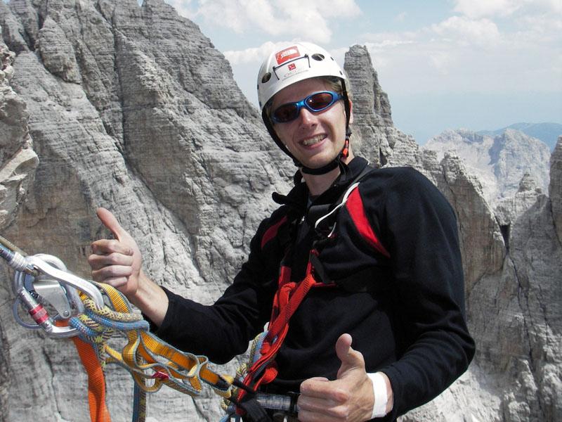 Po pár chvílích už za ním dolézám na pěkný jeskynní štand a přebírám vedení. Hned nad výlezem z jeskynního převisu do hladkého kouta mě čeká další hákovací místo. Cvkanu tedy jednu z mnoha nabízených skob a rovnou se pouštím do lezení. V pravé ruce slušnej bočák, v levé docela dobrá lišta na půl článku prstu. Opřu nohu do protěší stěny, že udělám celkem jednoduchý zdvih do dalšího chytu, však co se nestane, noha mi z té (mimochodem opravdu velmi hladké) plotny ujíždí a já si zkoušim, jaké to je, vlát na těch výše zmíněných chytech cca 200 m nad údolím. Sám chvíli žasnu, co to vlastně držim za jebky, ale jelikož je pořád ještě držím a nesedim svědomitě jistícímu Mikovi za krkem, nic nelením a tzv. "stylem mickey mouse" se dostávám přes inkriminované místo. A jako důkaz, že to opravdu nebylo žádné madlo, pak na prstech levé ruky nacházím lehce naříznutou kůži právě v polovině posledního článku. Následuje padesátimetrová délka nádherného exponovaného lezení s ještě několika šestkovými (podle mého subjektivního názoru možná i trochu těžšími) místy a krásný vzdušný štand pod poslední pětkovou délkou. Tu už Mik suverénně vyvádí, takže po pár chvílích svačíme pod vrcholem a poté i dolézáme (resp. spíše docházíme) na druhou nejvyšší horu brentských Dolomit, Cimu d Ambiez.