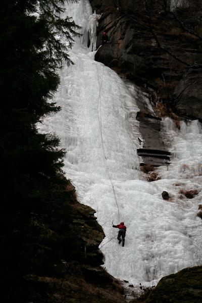 V neděli už bylo nad nulou, foukal vítr a lehce sněhopršelo. Turci lezli dvoudélkový Dreifaltigkeitsfall (WI 3), my třídélkový Superfeucht (WI 4+). O něm píší, že patří k nejkrásnějším ledopádům v Maltě, a myslím, že to můžeme potvrdit. Snad jen kdyby byl trošku sušší. Především slanění, při kterém si vyždímáte úplně mokré lano úplně mokrými rukavicemi na úplně mokré kalhoty, nebylo příjemné.
