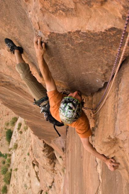 7. den máme vybranou cestu La Mot de la Fin na Z stěnu North Nassrani, přístup sotva půl hodiny, po první délce a půl nechápeme, jak se dostaneme dolů, protože štandy tu nejsou, takže v průvodci uvedené slanění nepřichází v úvahu a sestup jinou cestou nemáme vyfocený. Navíc decentní srajda, tekutost je přímo odvislá od tekutosti včerejší omeletky, tak slézám zpět k Viktorovi a zavěšujeme pytel. Odpoledne lezeme starou známou Flight of Fancy (5+, 5-, 6a, 6b, 5+, 5+), na East Dome of Jebel Rum, což jsou hezké spáry a skvostný prstový sokolíček a večer ještě 1. délku cesty Mano Negra, flek za 7a+ prasíme, zbytek čistě, velká paráda po vlastním s pár bh. Večer ukládáme naše opocené trvanlivé salámy do ledničky v Rest house.