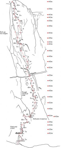 Na Moderních časech je zajímavé ještě to, že jsou psány za 7+ a není možné lézt stylem OO (tj. obtížné ojebu/oblezu). Papírově nejtěžší je hned první délka. Povídám Mírovi, který právě vyběhnul trojkové předskalí a dobírá mě u štandu: "To sis moc nezalezl, dáš si i tu další?" - "Né, budeme se normálně střídat" odvětí na to. Je to fakt kamarád, pomyslím si a pak ještě něco sprostého a obírám jej o matroš. Zkuste si někdy o půl šesté ráno, v zimní bundě a s partičkou Italů stepujících pod nástupem za vámi vylézt podobnou délku. V úvodní plotně jsou naštěstí čtyři skoby. Trochu řeším, jak zkřížit ruce a přebrat dvě lišty, když nohy musejí držet jen na tření, ale nakonec se to podaří, i když do poslední skoby musím odsednout. Nade mnou je asi osmimetrová koutová spára naprosto nevhodné šířky zakončená skobou se smycí. Strkám si zkřehlé ruce do podpaží a dávám dva marné pokusy hnout se dál. Italům dochází trpělivost a nastupují do vedlejší, o něco lehčí linie jménem Gogna. Jestli jsem se před vteřinou zamýšlel nad možností slanit a lézt něco jiného, tímto definitivně padla. Jednak bychom byli za blbce - znemožnit jim výstup a pak se na něj vykašlat, jednak bychom před sebou měli rovou dvě lanová družstva. Zkrátím to. Založil jsem cestou uzel a dva vklíněnce, do každého odsedl, ale nakonec úplně hotový s očima navrch hlavy Míru dobírám u prvního štandu. S batohem toho má plné kecky a tváří se, jako že jdeme dolů.