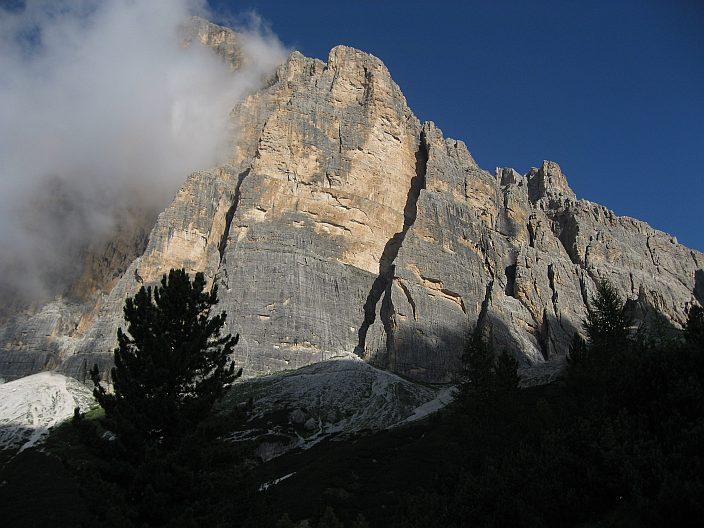 Po noční bouřce na parkovišti u chaty Auronzo čekáme, až se hrana aspoň trošku ohřeje, abychom nelezli v úplné ledárně. Při příchodu pod stěnu vidíme v první délce už jedno lezecké družstvo, ještě štěstí, že bude brzo odlézat doprava za hranu a nebude nám házet šutry na hlavu.