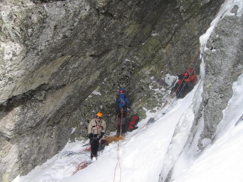 Ve stredu planuji uz odjezd, nejprve se snazim presvedcit Martina na Bradavici, ale nechce se mu do toho. Tak volime vedlejsi cil, Westerov stit. Slapeme za Gobem a Mastou zlab mezi Westerovym a Kupolou, Gobo s Mastou chteji jit jen na Kupolu. Nahore v sedle se Martin rozhoduje, ze na Westeruv uz nepujde. Mezitim dochazi Mato s Pilom, ze pujdou take na Westeruv, tak se pridam. Do toho se objevuje Gobo, ze Martina vystrida a pujdeme spolu. Za dvema skalnimi hroty nachazim za jednim kamenem diru v preveji. Jen se do ni podivam, asi dychnu na prevej, ta se v delce asi 5m utrhne a pada do Velke studene doliny do zlabu kterym jsme sli nahoru. Alespon uz na nas nespadne az pojedeme dolu. Pres par skalnich hrotu dochazime k asi 35m vysvihu, Mato s Pilom se navazuji, my s Gobem koumame kudy do toho, nakonec Gobo naleza solo, tak zase balim lano nasleduji. Kameny zalite ve firnu az ledu, cepin i macky drzi a tak jsme za chvili nahore. Nachazime smyci, bude se hodit na slaneni. Prechazime opet par hrotu a vylezame jeste jednu asi 20m stenku na predposledni hrot pred hlavnim vrcholem a uz jsme nahore. Zpet 2x slanime a uz jedeme zlabem dolu.