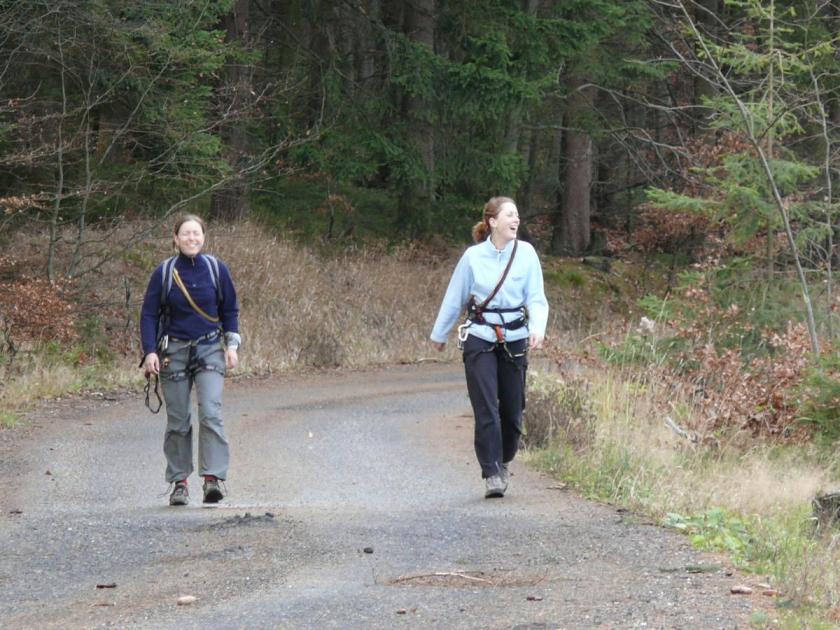 Směr 18. Hele novej průsek, to je jak dálnice k 54. Jen do kopce, ale vyplatilo se. Hurá zase na 18, má tam být info o bonusovce. No to si dělaj prdel slaňovat z téhle břízky. "Hele kolik vážíš", v duchu se ptám holky předemnou. "55?" Tak těch 30 navíc to snad zvládne. Bonusová 605m daleko. "A co hledáme." "Já nevim, asi vršek, sem si to zapoměl přečíst." "Tak uvdíme." Fuj, naštěstí je to na tringulanci. Zpátky k lezeckejm.