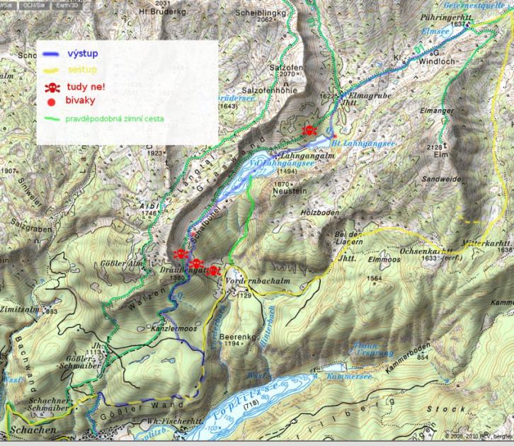 Když nám Omarek, který vyrazil o den dříve posílal zprávu, že bivakují, trochu jsem znervózněl, ale na útěk už bylo pozdě. V sedm ráno se na Kačerově scházíme u auta. Víťa, čerstvě informován o Omarkově bivaku, začíná postrádat péřovku, kterou zapomněl doma. Cestou řešíme, zda-li spacáky ano, či ne. Počet plechovek piva, který je nutný vynést na chatu a jiné nezbytnosti, jako jestli nechat mačky, lano, sedák, nebo cepín nakonec v autě. Někde za Lincem zastavujeme na dálnici v odstavném pruhu abychom se trochu protáhli při výměně kola. Škoda drahocenného času. Nakonec jsme asi o půl jedné v Goesslu. Usuzuji, že je nutné zvětšit motivaci pro dojití na chatu, a nechávám si spacák v autě. Víťa již v Praze usoudil, že talířky na hůlkách jsou zbytečná zátěž, a nechal je doma. Hotfix v podobě dvou sešlápnutých plechovek od piva se ukazuje jako dočasné nejlepší řešení. Vytvořením mi hned zlehknul batoh o kilo. Vodu zapomínám v autě. Když si na to vzpomenu, "však je to jen 4,5 hoďky, to se pro ní nebudu ten kilák vracet".