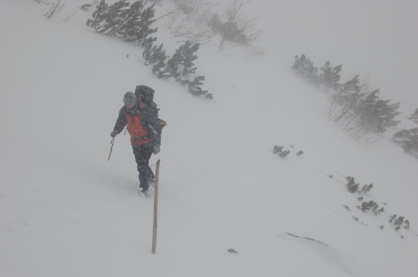 V Hangu se rozpoutalo peklo. Ti rozumnější nazuli mačky hned na začátku, dokud to šlo a někdo vyměnil hůlky za cepín. S přibývajícími výškovými metry se stupňovala síla větru. Chvíli jsme se bořili do sněhu po kolena a vzápětí balancovali na firnu, vítr nás srážel na kolena, párkrát jsem musela zaseknout cepín, aby mě prudký vítr neporazil. Ruce zmrzlé na kost, přes vítr a sníh nebylo vidět na 20 metrů a i když jsem tušila, že kousek přede mnou je Alda s Waldou, jejich stopy hned zavál sníh. Obrázek jak ve filmu. Dva kroky, probořim se a vítr mi nedovolí vstát. "Vstávej, dojdi ještě k tomhle kameni!" Na minutu "chůze" minutu odpočívám. "Musíš! Tady neumřeš!" Spolu o sebe se strachuju o některé, co jsou ještě kdesi za mnou. Zvládnou to všichni?