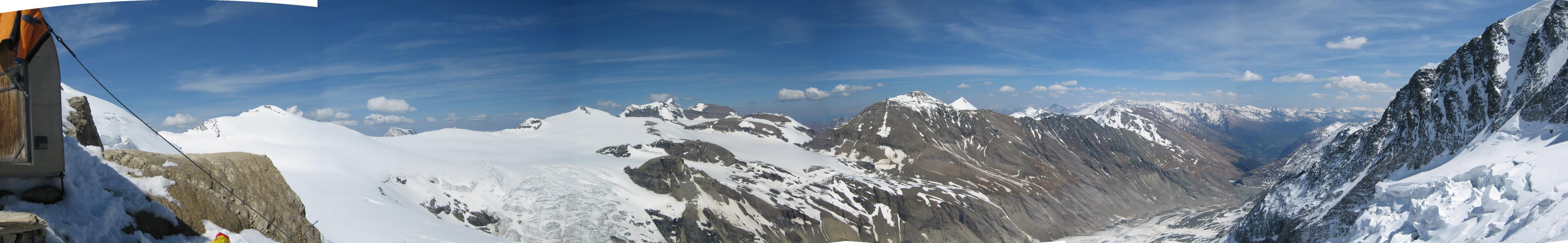 V 8:15 vyrážíme směr Glockner bivak. Raději dříve, s takovou předpovědí bude o něj určitě zájem. Po ledovci až pod stoupání žlabem na sněhové pláně pod bivakem se mi jde dobře. Pak to začíná. Funím, zastavuju, každou chvíli hlásím "přestávka". Znám svůj problém. Po každé takové přestávce to rozpálím a do dvou minut jsem s dechem v koncích a musím zase odpočívat. Zkouším tedy jít co nejpomaleji, tak abych to udýchal. Až do místa kde začínají skály hřebínku, na kterém stojí bivak, to jde. Ale pak se začíná jít velmi strmě vzhůru, takže opět samá pauza. Goba to nakonec přestane za mnou bavit a vyráží dopředu. Brzy mizí a mě to už vůbec ale vůbec nešlape a tak dávám müsli tyč a čaj z termosu, asi 20 minut odpočívám a vyrázím dál. Po 50 metrech za dalším výšvihem s překvapením už vidím bivak, tak to tam pomalu došourám. Jsem trochu na šrot, Gobo tu už přes půlhodinu odpočívá na palandě, tak se přidávám. Vyhlížíme Masťu s Peťom, ale místo nich dochází nějaký jiný maník a zjišťuje, jestli se ještě vejde. Ptáme se na kluky a prý to asi 300 výškových metrů otočili, že se na to necítí. Hm, klíče od auta nemají, ale výbavu na přespání si s sebou nesli, tak holt nějak do zítřka přečkají dole. Na bivak postupně dochází další, nakonec je počet na přespání 10. Odpočíváme, asi hodinu a půl rozehříváme sníh na čaj a polívku a kolem sedmé zalézáme do spacáků. Usínám tak kolem osmé, v jedenáct se budím, nemůžu usnout a pobolívá mě hlava, asi z té výšky. Je mi vedro, tak vylézám ze spacáku a pak už se daří opět zabrat.