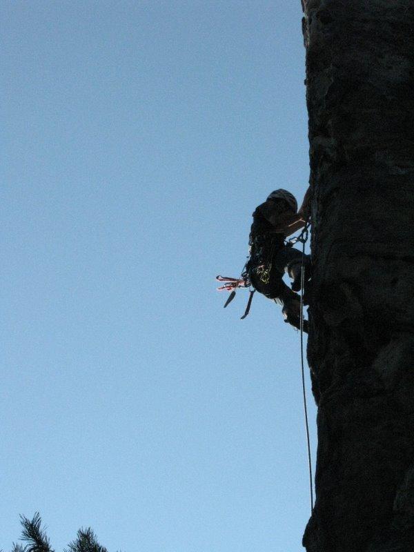Po svačině se Martin vrhá na Daliborku do Výří cesty. Nějací klasičtěji vyhlížející strejdové přiběhli zrovna, když jsme se navazovali, a že prej to vezmou variantou přes předskalí. Nakonec si přeci jen nechali vysvětlit, že varianty většinou končí tou samou cestou, ale i tak byli nahoře stejně rychle jako my, jen to vzali přes (nesoutěžní) Mravenčí cestu. Hold nejde-li to dveřmi... Normálka na Knihu je pro klasického hustce, jako je Martin, procházkou anglickým parčíkem. Já za ním bohužel zjišťuji, že lezení v tílku má i své nevýhody, zvlášť když se jedná o dvacetimetrovou spáru.