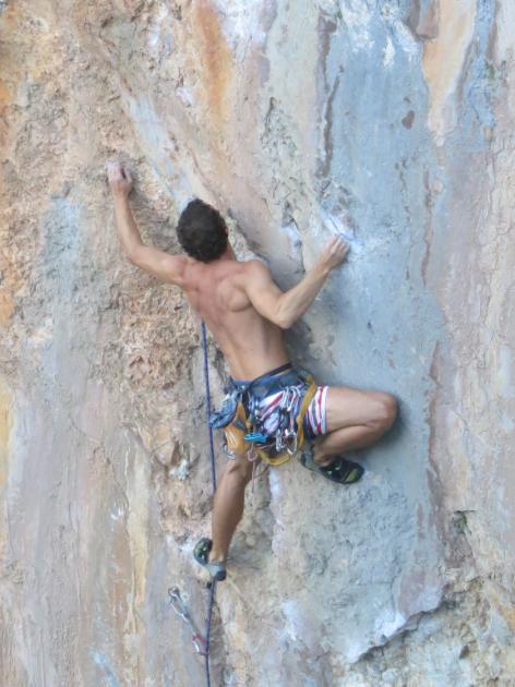Lezení začínáme v jeskyni Magara, která je hned naproti dlouhé řadě krámků nad korytem vyschlé řeky. Je zde několik celkem pěkných cest s vypečeným cvakáním poslední expresky, kde se převis mění ve strop. Protože si chceme před odjezdem stihnout ještě trochu zahrotit, zkoušíme cestu Bad Karma (7b). Spodní pasáž s několika zajímavými kroky ještě celkem ujde, ale nahoře je to takové zoufalé plácání po dvou tufách na stisk. Já mám ovšem na vymýšlení sekvencí lidi, takže nechám veškerou objevovací a zkoušecí činnost provést Vojtu, který správý program nakonec odhalí, a ve třetím pokusu si odnáší zápis do deníčku. Já to zkouším několikrát, z počátku zoufalství, následně se to