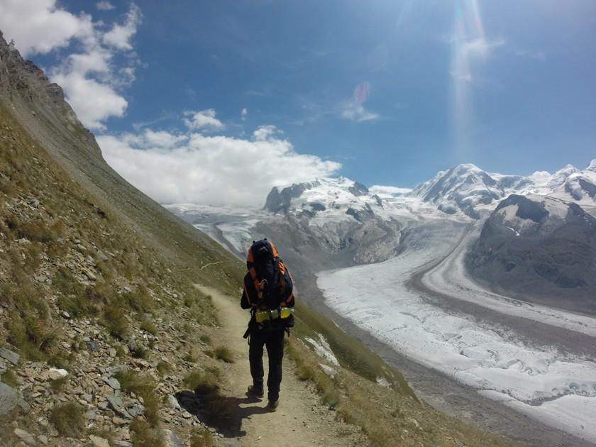 Po přespání vyrážíme stejnou cestou zpět, pouze vrchol Alphubelu obcházíme zleva a napojujeme se na vyšlapanou cestu po ledovci východním svahem. Tím jsme ušetřili čas a síly a také se vyhnuli ledovému hřebenu. Když se ocitáme opět v sedle Feejoch, tak v rámci tréningu ještě vybíháme na vrchol Allalinu (4027m). Při návratu lanovkou dolů potkáváme vyborného českého vůdce Viktora Kořízka. Dáváme se sním do řeči a výstup na M.Blanc nám silně nedoporučuje. Dovídáme se, že je opět zavřená chata Gouter, tzn. i normální výstupová trasa, po které jsme chtěli jít. Místo toho nám nabízí alternativu ať zkusíme Dufourspitzi, kde naopak panují ideální podmínky. Po návratu do kempu jsme tedy zasedli k internetu, zjistili vše potřebné a je rozhodnuto. Expedice Mont Blanc je přejmenována na Expedice Monte Rosa.