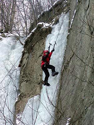Slyším, jak lezou prvolezci, přemrzlý led se tříští pod kovovými zobáky jejich cepínů a hroty maček do něho vrážejí s velkým úsilím. Konečně přicházím na řadu. Snažím se poprvé zaseknout cepín do čistého ledu, ale úder se nedaří, špice odskakuje. Teprve sbírám zkušenosti. Konečně cepín zasekávám správně a já můžu popolézt o pár centimetrů a zakopnout i mačku do ledu. Ta drží, je to dobré. Pomalu postupuji vzhůru. Dvakrát lehce to nejde, ale pomalu se šinu nahoru. Občas mi cepín vypadne z ledu a někdy odtrhne do údolí i několikakilogramový kus nedržícího ledu.