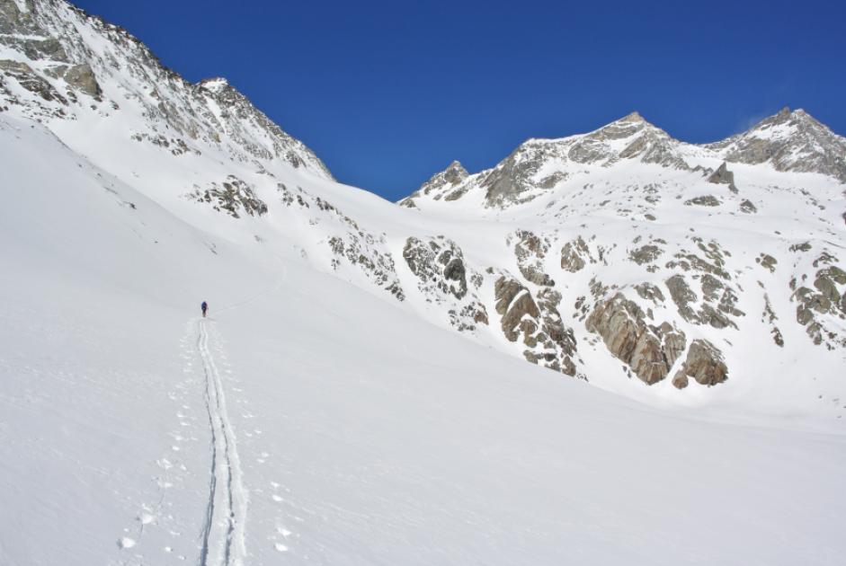 Na chvíli se ukáže přes údolí Venediger, tak rychle pár fotek. Sjezd je samozřejmě od kříže, tentokrát rovně dolů na ledovec, a následně ve stopách výstupu. Ti kteří si dobře prohlédnou při cestě nahoru ledovec a zejména skalky pod ním, mohou zvolit i odvážnější trasu. Máme kliku, mrak úplně zmizel, a tak si i sjezd užíváme na sluníčku. Místo výstupu proti bílé zdi je to příjemná změna.