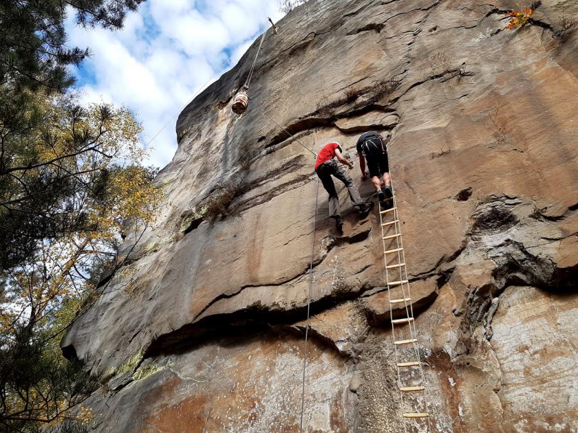 Zpestřením letos byli Erik a Brejchy, kteří experimentálně optimalizovali své vybavení pro technické lezení a techniku traverzu zhoupnutím. Vybavení pak dali k dispozici i ostatním. Objevil se i Geo, aby si vymazlil ideální délky prusíků pro výstup z trhliny. Ani ostřílení horolezci totiž nepohrnou příležitostí pilovat své dovednosti a sladit se s ostatními.