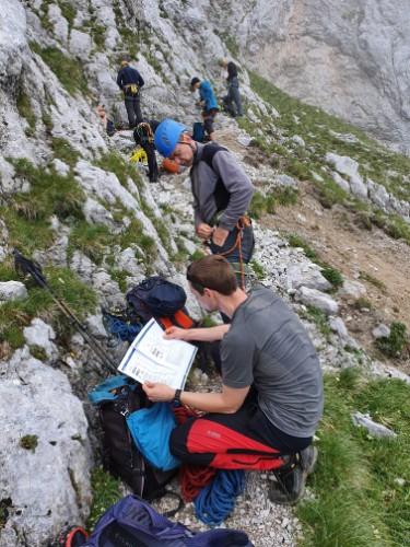 Ve čtvrtek ráno nám počasí opravdu přálo, slunce jako z pohlednice a nebe bez mráčku. Cesta k nástupům byla tak akorát, zhruba 400 výškových metrů. A tak jsme se do hodinky už vázali na lana a nastupovali do cest. Celá naše skupina se přiměřeně rozprostřela po celé jihozápadně stěně Kalblingu (2 196 mnm) a začali jsme stoupat k vrcholu. Cesty byly krásné, v těžších úsecích odjištěné a celkově byli všichni s prvním lezeckým dnem spokojení. Odpoledne jsme si mohli vychutnat krásný výhled z vrcholu kopce, až do Národního parku Gesäuse. Večer se opět nesl v duchu společného veselí.