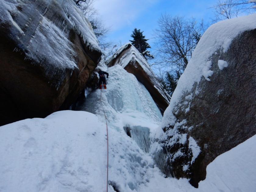 Nad zatáčkou je dobře vyledněný nejdelší ledopád a nad ním v koutě po pravé ruce je přístupný slaňovací kruh, nebo po levé ruce mohutný pařez se starou smyčkou. Ze dvou strmých stupňů ve svahu vlevo od něj je zaledněný jen horní. Spodní stupeň je pouze zasněžená kamenná plotna, po které lze lézt pouze pomocí padlého stromu stylem drytooling. Nad silnicí je už částečně narostlý hlavní led v roklině. Dostatek ledu je na cvičné položené stěnce u silnice vpravo vedle rokliny.