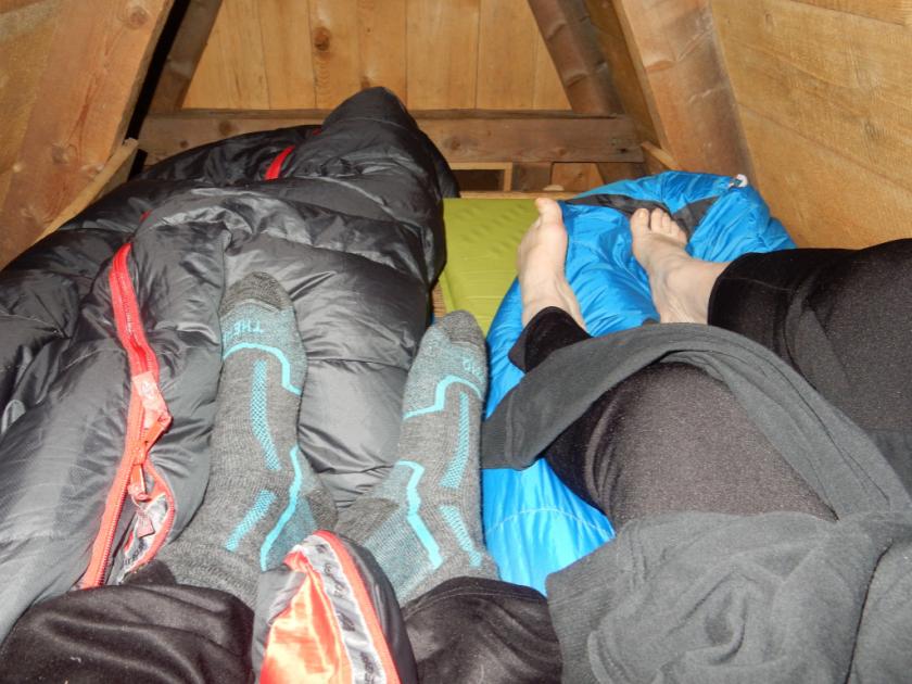 Lyže připoutáváme na batohy a jdeme pěšky. Další člověk, kterého tento víkend potkáváme, je zbloudilý koloběžkář na elektrické koloběžce. Další bivakovací boudu si prohlížíme na Slunečné stráni (650 m).
