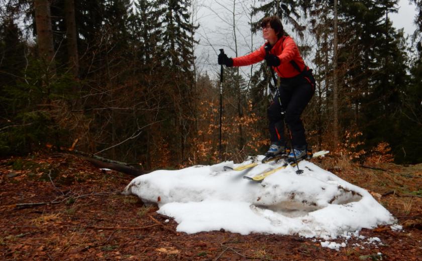 Opouštíme zelenou turistickou značku a jedeme po červené. Širokou lesní silničkou po úbočí Mravenečníku (980 m) dojdeme k Rýchorskému kříži (957 m). Tady už šoupeme lyže pouze po trávě úplně bez sněhu.