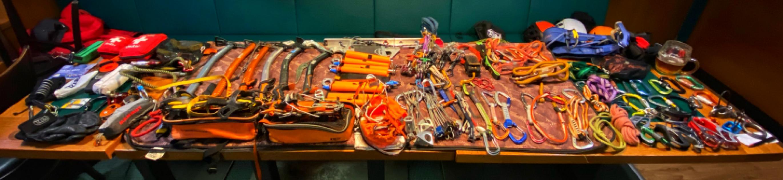 Po krátké pauze na vydechnutí a objednání dalšího pivka, pokračujeme dále. Na řadě jsou specifičtější druhy materiálu: Všichni přítomní napjatě poslouchají výklad o různých druzích maček, o cepínech, šroubech do ledu, blokantech, kladkách.. Kromě zaujatých výrazů nováčků, vypadá stejně ohromeně i místní kuchař, který pozoruje Happyho skrz sklo z kuchyně.