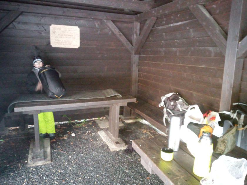 Tento přístřešek není tak luxusní jako ten minulý. Je menší, teče do něj a vítr sem nanosil sníh. Konfigurace na spaní je stejná jako minule. Jen stůl je kratší a lavice užší.