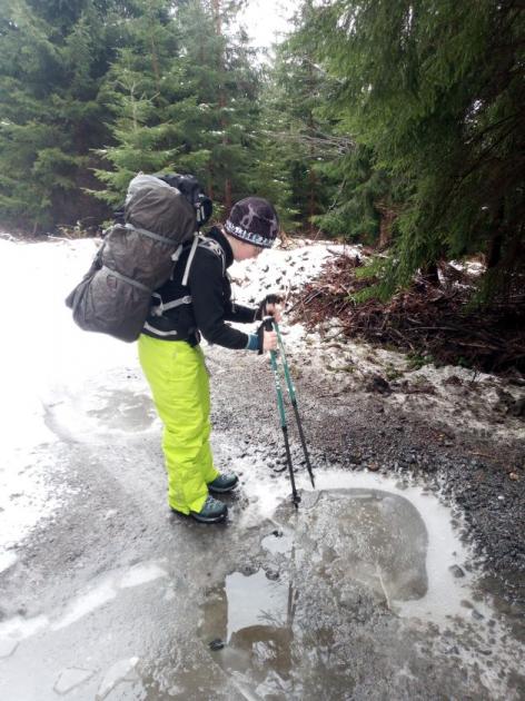 Hned za Rudou potkáváme dvojci skialpinistů. Setkání zažehne jiskru naděje, že bude sníh. Zbytečně, krom jednoho běžkaře s lyžemi v rukou již žádné jiné lyžníky toho dne neuvidíme. Cesta je téměř bez sněhu, místy prohrnutá na asfalt. V lese nastává další mrzutost. Z pocukrovaných stromů v podstatě regulérně prší. Až kus za Čertovým jezerem se cesta rozšíří natolik, že déšť napadá na nás. Je tu dokonce i sníh. A tak to vydrží až na bývalý Stateček - cíl naší dnešní cesty. Je zde luxusní turistický přístřešek. Za posledního světla připravím večeři. Ríšu uložím na stůl a sám si lehnu na lavici, je docela úzká. Je šest večer, rozednění nastává po sedmé, noc bude dlouhá.