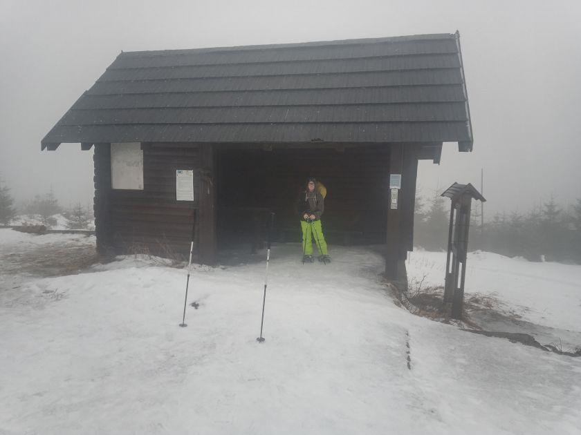 Celou noc bylo nad nulou a rano tomu není jinak. Naštěstí neprší. Po čaji a snídani vyrážíme směr Špičácké sedlo. Sněhu je pomálu. U odbočky na Černé jezero začne pršet a cesta je čistý led. Na sedlo dorazíme promočení a spruzení. Je čas jet domů, tohle nemá smysl. Ještě před odjezdem zajdeme do hospody. Teplý oběd, dvě piva, horka čokoláda, jen pět kilometrů do cíle a bezdeští změní naše ústupové plany. Za sedlem začne i sníh a ke slovu příjdou i sněžnice. Vše se v dobré obrací. Ale jen na hodinu, pak začne znovu pršet. Naštěstí s přibývající nadmořskou výškou přechází ve sněžení. Jsme na Můstku, jak strašlivé je toto místo. Je zde přístřešek, konec upravené běžkařské stopy, mlha, déšť se sněhem a vítr.
