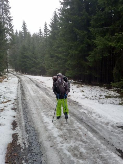 Hned za Rudou potkáváme dvojci skialpinistů. Setkání zažehne jiskru naděje, že bude sníh. Zbytečně, krom jednoho běžkaře s lyžemi v rukou již žádné jiné lyžníky toho dne neuvidíme. Cesta je téměř bez sněhu, místy prohrnutá na asfalt. V lese nastává další mrzutost. Z pocukrovaných stromů v podstatě regulérně prší. Až kus za Čertovým jezerem se cesta rozšíří natolik, že déšť napadá na nás. Je tu dokonce i sníh. A tak to vydrží až na bývalý Stateček - cíl naší dnešní cesty. Je zde luxusní turistický přístřešek. Za posledního světla připravím večeři. Ríšu uložím na stůl a sám si lehnu na lavici, je docela úzká. Je šest večer, rozednění nastává po sedmé, noc bude dlouhá.