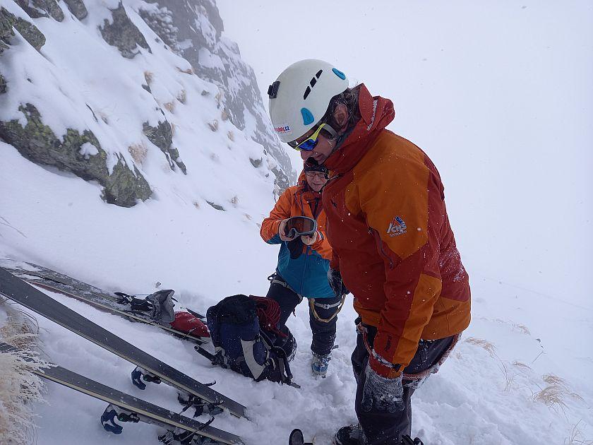 Kuba, Hanka a Janča jeho směr narovnali a vzali to rovnou dolů cca 43°. Styl byl poněkud expediční, když se dámy spouštěly na lyžích pomocí lana.