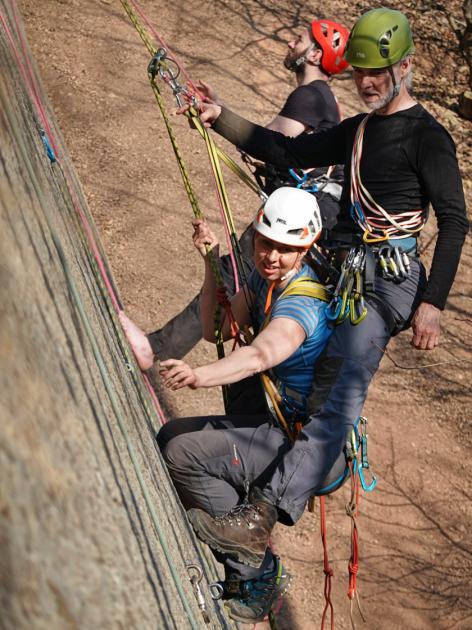 Na skále jsme se snažili zmobilizovat a každý si svým tempem oblékal sedák a diskutovali jsme strategii, jak se k Jakubovi dostat a jak ho zachránit a kdo by co mohl...
