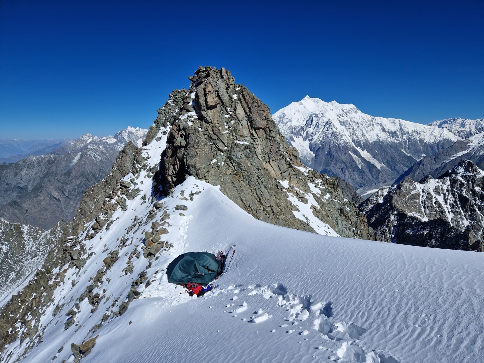 Následovala vynáška jídla a plynu do sedla v 5080m. Ukázalo se, že byl odhad správný – šlo tam vysekat do ledu plošiny na dva stany. S hlášeným oknem 3,5 dne pěkného počasí jsme vyfárali na těžko do sedla a tam zřídili C1. Avšak nedaleko za C1 bylo první klíčové místo – lesklý ledový svah s traverzem pod sérakem o sklonu > 60st, na kterém místy leželo tak 30cm čerstvého sněhu. Na to jsme měli málo lan, šroubů a zejména moc těžké svině na zádech. Strávit příští 4 dny na 2,5km dlouhém exponovaném hřebenu ve výšce mezi 5ti a 6ti tisíci by nebyla zrovna rekreace. Takže druhý pytel.
