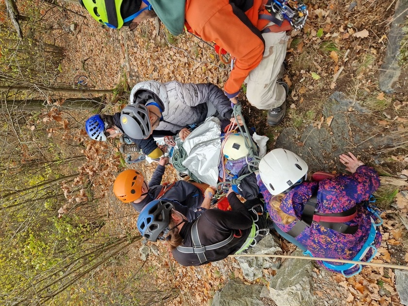 Slaníme jednu délku a vidíme, že s Kubou je jeho syn Mates, oba silně podchlazení, vyčerpání, dehydrovaní, ale zajištění proti pádu. Mates příliš nereaguje, je ztuhlý a komunikace vázne. Kuba reaguje až příliš, žvaní nesmysly, má potřebu se angažovat a podaný čaj zvrací. Profi záchranka o nás již ví, ale letová situace neumožňuje start vrtulníku a máme za úkol dostat postižené na silnici, kde je nabere sanitka. Není čas ztrácet čas, jeden záchranář pokračuje dál a staví sestupovou cestu. Zadání úkolu a náhoda tomu chtěla, že je třeba udělat další štand a bude nutné s postiženými přesedat. Na štandu je připraven záchranář a sestup s prokřehlými horolezci může začít. Nejdřív jede mumlající Mates, ve společném závěsu na zádech dorazí na postupový štand, kde se to lehce zadrhne, ale podaří se zmrzlíka předat a dojet s ním až dolů. Nosítkáři jsou ready, zabalí jej do termofolie, začnou se zahřívání a vázáním do nosítek. Ještě nám na polici zůstal Kuba, toho je trochu větší kousek a tak musí nastoupit záchranář jak hora, aby s ním sjel ke štandu. Tam na něj naopak může čekat nejkřehčí záchranářka dnešní akce, jelikož předání, již visícího Kuby je snadné. Ale ouha, cesta dolů s Kubou způsobí kamenou lavinu a je tedy nutné odnést Matěje do bezpečí, nosítkáři a část záchranářů čapnou improvizovaná nosítka a díky vyvázané cestě, je možno transportovat nešťastníka v horizontální poloze až na silnici. Kuba zatím dojede dolů, je zahříván, uvázán a připraven k transportu. Gravitace nám opět vysvětlí, že rozdíl otce a syna není pouze v letech a s druhým nezvedencem se tým pronese o něco více.