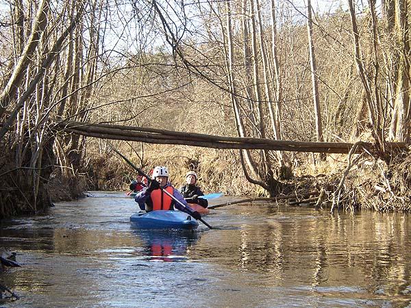 Spád potoka není příliš velký, meandry jsou prošpikované naplaveným dřívím, ale všechno se dá při troše opatrnosti projet. Bidlo a Beruška jsou na kajaku v podstatě nováčci, já s Komárem a Bludem občas něco sjedeme a pouze Klára chodí trénovat se školou na kanál do Tróji. Jediného Čochtana samozřejmě chytá ona. Kláda na hladině, kterou všichni bez potíží přejíždíme, ji zabrzdí, proud si podá záď lodě a Klára padá do vody. Eskymák se podle očekávání nezdařil a ona potupně mizí ve studených vlnkách.