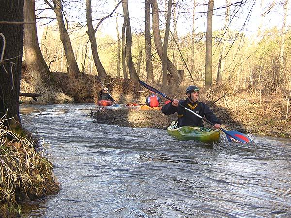 Nasedáme ve Vlašimi a s radostí zjišťujeme, že v kilometráži popsané zarostlé úseky pracovníci povodí vyčistili. Říčka se kroutí lesními meandry, občas mineme nějakou chatu a čas od času plavbu zpestří jez. Před každým poctivě vystupujeme a prohlížíme, protože se nám nechce koupat v ledové vodě.