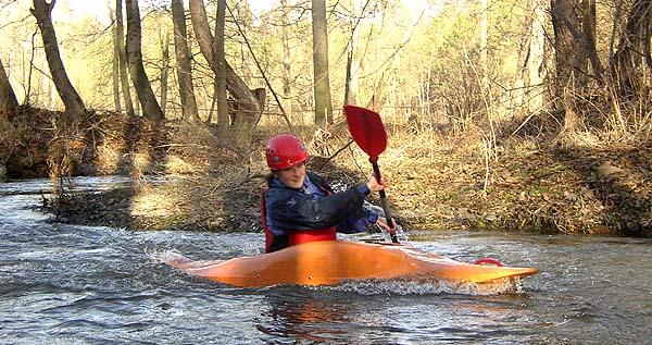 Spád potoka není příliš velký, meandry jsou prošpikované naplaveným dřívím, ale všechno se dá při troše opatrnosti projet. Bidlo a Beruška jsou na kajaku v podstatě nováčci, já s Komárem a Bludem občas něco sjedeme a pouze Klára chodí trénovat se školou na kanál do Tróji. Jediného Čochtana samozřejmě chytá ona. Kláda na hladině, kterou všichni bez potíží přejíždíme, ji zabrzdí, proud si podá záď lodě a Klára padá do vody. Eskymák se podle očekávání nezdařil a ona potupně mizí ve studených vlnkách.