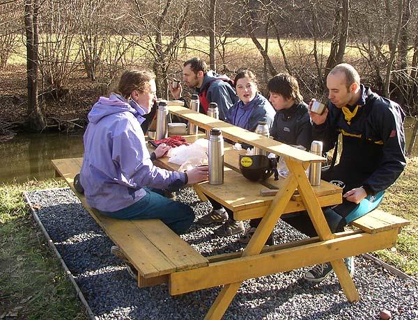 První místo, kde vysedáme, je nad jezem Spáleného mlýna. Lavička s dvoupatrovým stolem stojí na sluníčku, a tak není co řešit. Svačina a horký čaj nás dostávají do nálady. Možná za to mohl i rum.